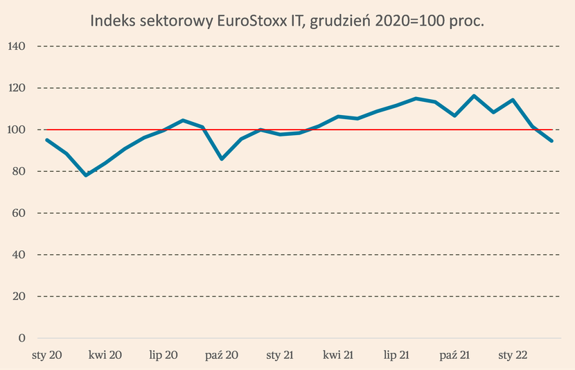 Kursy akcji omawianych spółek, zwłaszcza z obszaru IT, zyskały od początku pandemii, jednak wzrosty te nie były spektakularne na tle wzrostów spółek z wielu pozostałych branż. W szczytowym momencie, który przypadł na listopad 2021 r. indeks obrazujący notowania spółek informatycznych znajdował się ok. 22 proc. powyżej poziomu sprzed pandemii, czyli ze stycznia 2020 r. oraz ok. 17 proc. powyżej poziomu ze stycznia 2021 r. W dodatku od wspomnianego szczytu indeks stracił już prawie 19 proc. i znajduje się na poziomie sprzed wybuchu pandemii. Jeśli więc założyć, że inwestorzy faktycznie zweryfikowali oczekiwane tempo cyfryzacji i na tej podstawie oceniali potencjał spółek IT oznaczałoby to, że jest ono mniej więcej takie samo jak przed pandemią.