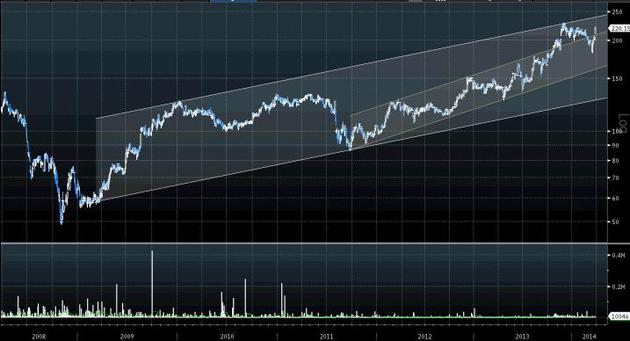 Kurs Grupy Kęty powrócił powyżej górnego ograniczenia kanału zwyżkującego, który opisywał tendencję rosnącą z ostatnich dwóch lat. Powrót do wewnątrz formacji, który nastąpił w ostatnich tygodniach, okazał się zatem mylnym sygnałem. Wsparciem staje się wspomniane górne ograniczenie kanału (215 zł) i na tym pułapie powinna zatrzymać się ewentualna korekta. Kurs powinien wkrótce wyjść na historyczny szczyt, a celem dla kupujących powinno być 245 zł, gdzie znajduje się opór w postaci górnego ograniczenia bardziej obszernego kanału poprowadzonego po szczytach i dołkach, sięgających 2009 r.