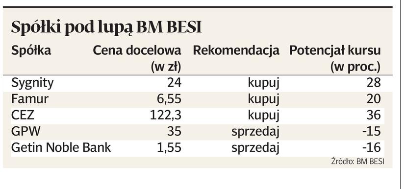 Eksperci podtrzymali zalecenie „kupuj” akcje CEZ. Zdaniem BM BESI, akcjonariusze energetycznej spółki mogą oczekiwać uchwalenia 7,3-procentowej stopy dywidendy. Analitycy zwracają także uwagę na relatywnie atrakcyjną wycenę papierów na warszawskiej giełdzie. — Mimo że spółka generuje gotówkę i posiada atrakcyjne aktywa, jest wyceniana podobnie do innych spółek energetycznych w regionie — tłumaczą eksperci BM BESI. Specjaliści mają również dwie nowe propozycje do portfela. Pierwszą z nich są papiery Famuru. — Uważamy, że rynek nie uwzględnia potencjału solidnych wyników finansowych, które spółka powinna pokazać w tym roku — argumentują eksperci.Biuro zwraca także uwagę, że 2013 r. to dobry okres do przeprowadzenia kolejnych akwizycji przez Famur. Drugi nowicjusz w zestawieniu przygotowanym przez BM BESI to Sygnity. Analitycy spodziewają się, że spółka może wygrać część przetargu rozpisanego przez ZUS (jest to teraz największy kontrakt w branży IT w Polsce). Poza tym biuro podkreśla, że wyniki finansowe za ostatni kwartał potwierdzają fakt wychodzenia Sygnity na prostą. Poza trzema spółkami, które powinny przynieść ponadprzeciętną stopę zwrotu, BM BESI wskazuje dwie, które w najbliższych miesiącach rozczarująinwestorów. Obydwie firmy należą do branży finansowej. Pierwszą z nich jest GPW. Zdaniem analityków, kluczową rolę odegra wysokość przyszłych premii dla akcjonariuszy. — Zarówno w 2013, jak i 2014 r. spodziewamy się zaledwie 1,9-procentowej stopy dywidendy. To znacznie poniżej oczekiwań rynkowych — uzasadniają eksperci BM BESI. Analitycy radzą pozbyć się także walorów Getin Noble Banku. W opinii BM BESI rynek nie uwzględnia faktu, że spółka Leszka Czarneckiego odczuwa silną presję na przychodach z prowizji oraz marży odsetkowej.