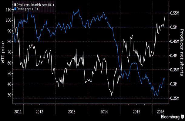 Ilość netto utrzymywanych przez producentów i pośredników pozycji zabezpieczających przed spadkiem cen ropy wzrosła w poprzednim tygodniu o 3,8 proc., do najwyższego pułapu od września 2011 r., wynika z danych komisji CFTC. To oznaka, że gracze z branży nie wierzą w kontynuację zwyżek, które od styczniowego dna wyniosły ceny ropy aż o 76 proc. w górę. Aby zabezpieczyć sobie przyszłą sprzedaż surowca po korzystnych cenach producenci korzystają z kontraktów futures, swapów oraz strategii zwanej rękawem.
