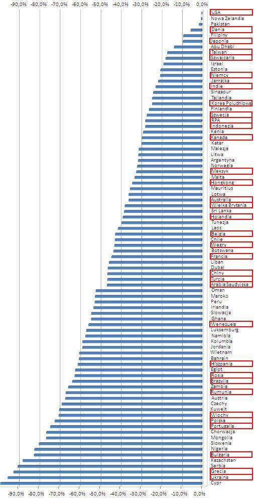 Na przeciwnym biegunie znalazły się indeksy z krajów, które ogłosiły niewypłacalność lub o bankructwo się otarły. Więcej niż 90 proc. od szczytów sprzed blisko dziewięciu lat straciły giełdy ukraińska, cypryjska i grecka. Pozostałe kraje grupy PIIGS zanotowały już niższy wymiar kary. Najlepiej poradziły sobie główny wskaźnik z Irlandii (-53 proc.) oraz indeks hiszpański (-61 proc.).