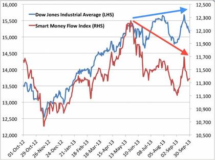 - Za każdym razem, kiedy Dow Jones wychodzi na nowy szczyt, a indeks sprytnego pieniądza tego nie potwierdza, zapowiadają się kłopoty – zauważa agencja Bloomberg.