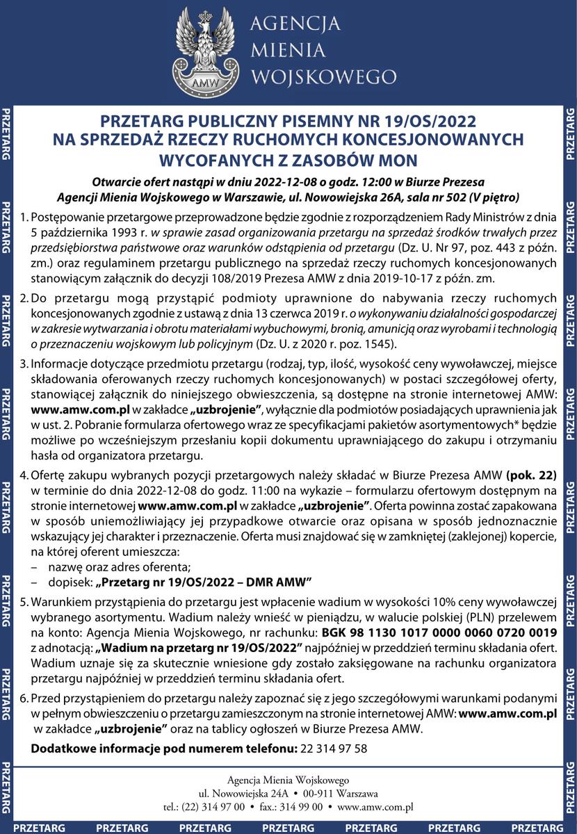 SPRZEDAŻ PRZETARGOWA – RZECZY RUCHOME KONCESJONOWANE. AGENCJA MIENIA WOJSKOWEGO_BIURO PREZESA Komunikat partneraopublikowano: 2022-11-23 12:49PosłuchajZostań subskrybentemi słuchaj tego oraz wielu innych artykułów w pb.pl