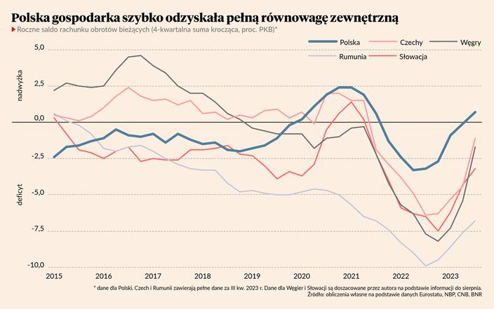 Jeżeli ostatni rok czegoś nas nauczył, to że na saldo (nadwyżkę lub deficyt) rachunku obrotów bieżących powinniśmy patrzeć dużo bardziej uważnie niż na saldo fiskalne. To drugie przyciąga większą uwagę obywateli, bo ogniskuje spory polityczne i wizje polityki gospodarczej, ale to pierwsze lepiej obrazuje stabilność gospodarki jako całości. To dlatego zagraniczni inwestorzy finansowi ławą powrócili na rynki Europy Środkowej w 2023 r., mimo że sytuacja fiskalna krajów wcale nie zaczęła się bardzo istotnie poprawiać (w przypadku Polski możemy wręcz mówić o pogorszeniu sytuacji fiskalnej kraju). Dostrzegli, że równowaga makroekonomiczna stopniowo wraca dzięki spadkowi cen energii i restrykcyjnej polityce pieniężnej, która zrównoważyła wydatki i dochody.