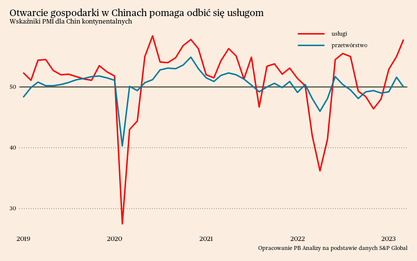 W Państwie Środka otwarcie gospodarki bardzo mocno pomaga sektorowi usług. Odczyt PMI wzrósł po raz kolejny, do poziomu 57,8 pkt, podczas gdy w dołku w listopadzie wskazanie wyniosło jedynie 46,4. Przesunięcie popytu w kierunku usług wynika ze zniesienia obostrzeń pandemicznych. Chińczycy korzystają z usług, których działalność była ograniczona przez prawie 3 lata. Jednocześnie skala odbicia nie będzie aż tak duża jak wcześniej na Zachodzie, ponieważ Pekin nie zdecydował się na zastosowanie programów stymulacyjnych podczas lockdownów.