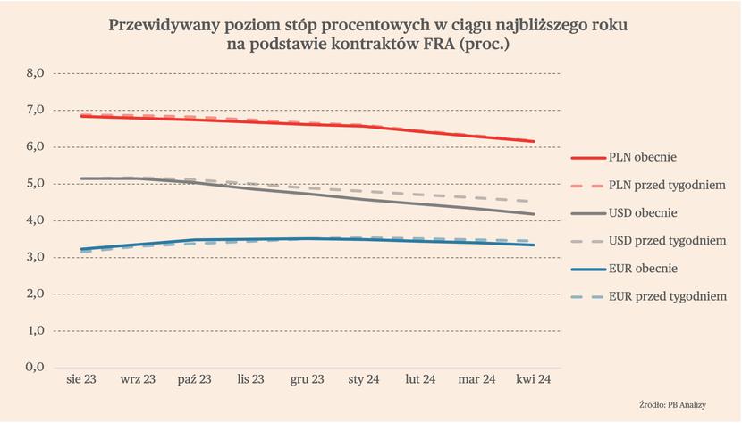 W ciągu ostatniego tygodnia rynek lekko obniżył swoje przewidywania co do przyszłej ścieżki stóp w USA. Obecnie kontrakty terminowe wyceniają, że nastąpi jeszcze jedna podwyżka stóp o 25 pb., do poziomu 5-5,25 proc., a od IV kw. zaczną się obniżki kosztu pieniądza w dolarach. Za rok stopa procentowa w USA ma znaleźć się na poziomie 4-4,25 proc.