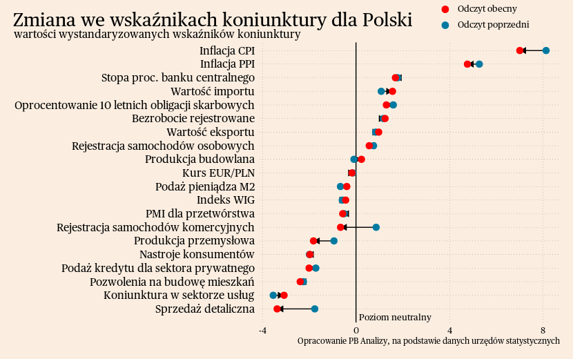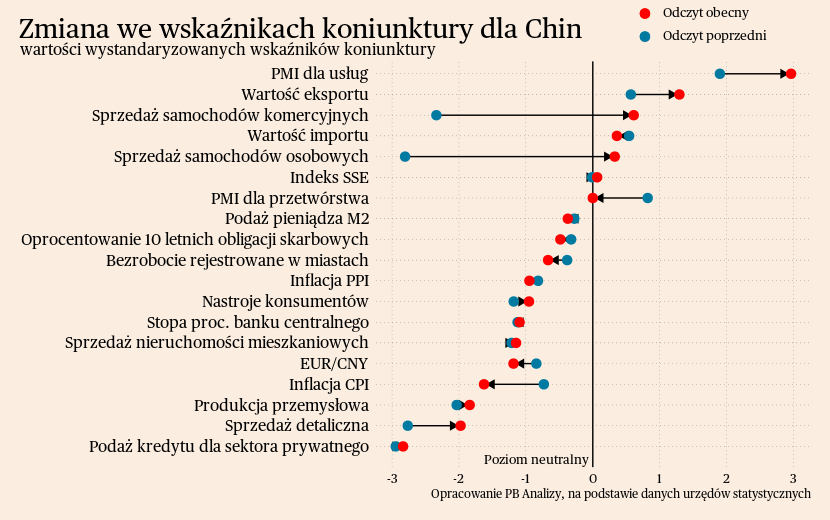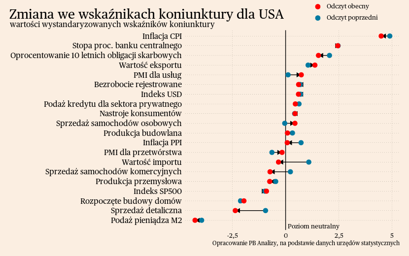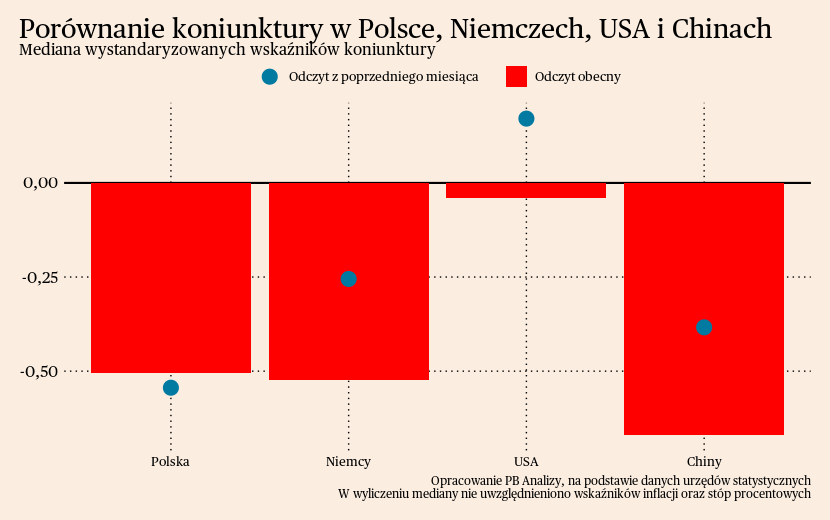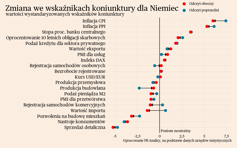 W każdy piątek aktualizujemy informację o stanie światowej gospodarki przez pryzmat 80 wskaźników z czterech gospodarek – Polski, Niemiec, Stanów Zjednoczonych i Chin. Wszystkie analizowane przez nas wskaźniki można obserwować i pobierać na naszej platformie danych PB Analizy. W tej analizie na wykresach dane pokazujemy jako odchylenie od średniej historycznej (skorygowane o zmienność), dzięki czemu możemy porównywać dane o różnych cechach statystycznych.