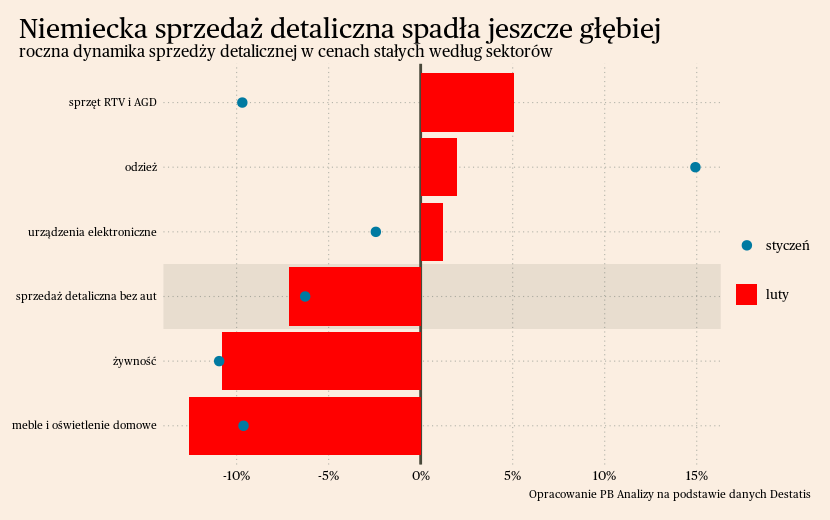 Sprzedawcy przejawiają znacznie mniej optymizmu niż przemysł. Roczna dynamika sprzedaży detalicznej spadła z -6,28 proc. w styczniu do -7,14 w lutym. Jest to odpowiednio trzeci i drugi najniższy wynik w historii szeregu czasowego, który sięga 1994 roku. Za gargantuiczny spadek odpowiada sprzedaż żywności, gdzie inflacja jest największa. Niemcy najprawdopodobniej przechodzą do tańszych wersji produktów, dokładając do negatywnej dynamiki sprzedaży. Mniejsze znacznie w tak negatywnym odczycie mają także meble. Sprzedaż w tej kategorii obrywa przez wysycenie rynku dobrami trwałymi po okresie pandemicznym (podsumowanie wskaźników makro dla Niemiec pokazane jest na Wykresach 2.-3. na dole).