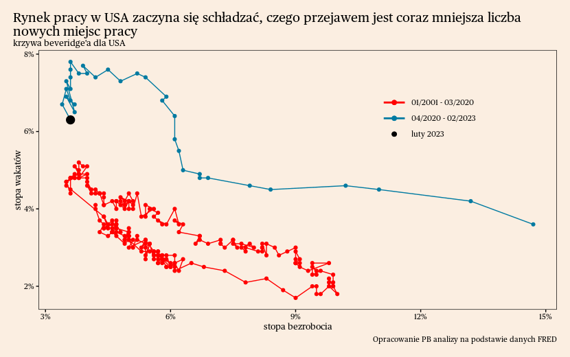 Łagodne spowolnienie postępuje też na rynku pracy w USA. Schłodzenie rynku pracy odbywa się przez ograniczenie skali nowych rekrutacji (co widać w spadającej stopie wakatów), a nie przez zwolnienia (co ujawniłoby się w rosnącym bezrobociu). Na wykresie widać to w stopniowo schodzącej w dół krzywej Beveridge'a. Dodatkowo na rynek pracy oddziałuje trend przesunięcia popytu w kierunku usług. Większość nowych stanowisk pracy powstaje w sektorach usługowych, w szczególności zakwaterowaniu i gastronomii (podsumowanie wskaźników makro dla USA pokazane jest na Wykresie 4. na dole).