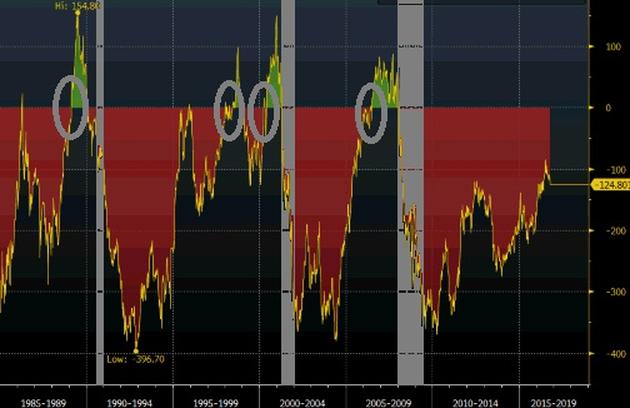 Różnica między główną stopą procentową Fedu a rentownościami 10-letnich obligacji USA (linia żółta). Wyjście różnicy powyżej zera jest tożsame z odwróceniem krzywej rentowności, co w ostatnich 30 latach poprzedziło każdą z recesji w gospodarce amerykańskiej. Recesje naniesiono na wykres jako szare pasy , a momenty odwrócenia krzywej zaznaczono szarą elipsą. Źródło: pb.pl, Bloomberg.