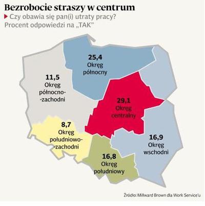 Rekordzistą, jeśli chodzi o wysokość bezrobocia, jest województwo warmińsko-mazurskie z ponad 16-procentowych odsetkiem osób bez zajęcia. Bezrobocie w województwach lubelskim, podkarpackim czy podlaskim wciąż jest sporo wyższe niż średnia dla kraju. To widać też w obawach o utratę pracy, która spędza sen z powiek blisko 17 proc. pracujących. Są jednak miejsca, gdzie sytuacja jest znacznie gorsza. Najczarniej zawodową przyszłość widzą mieszkańcy mazowieckiego i łódzkiego. Blisko 30 proc. pracowników drży o miejsce pracy, i to w sytuacji, gdy bezrobocie wynosi tam odpowiednio 8,9 i 10,9 proc.