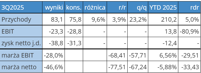 Przychody wyniosły 83,1 mln zł, czyli były o 9,6 proc. wyższe niż zakładał konsensus i wyższe o 3,9 proc. rdr. Strata operacyjna wyniosła 23,3 mln zł. Konsensus zakładał 28,8 mln zł straty EBIT.