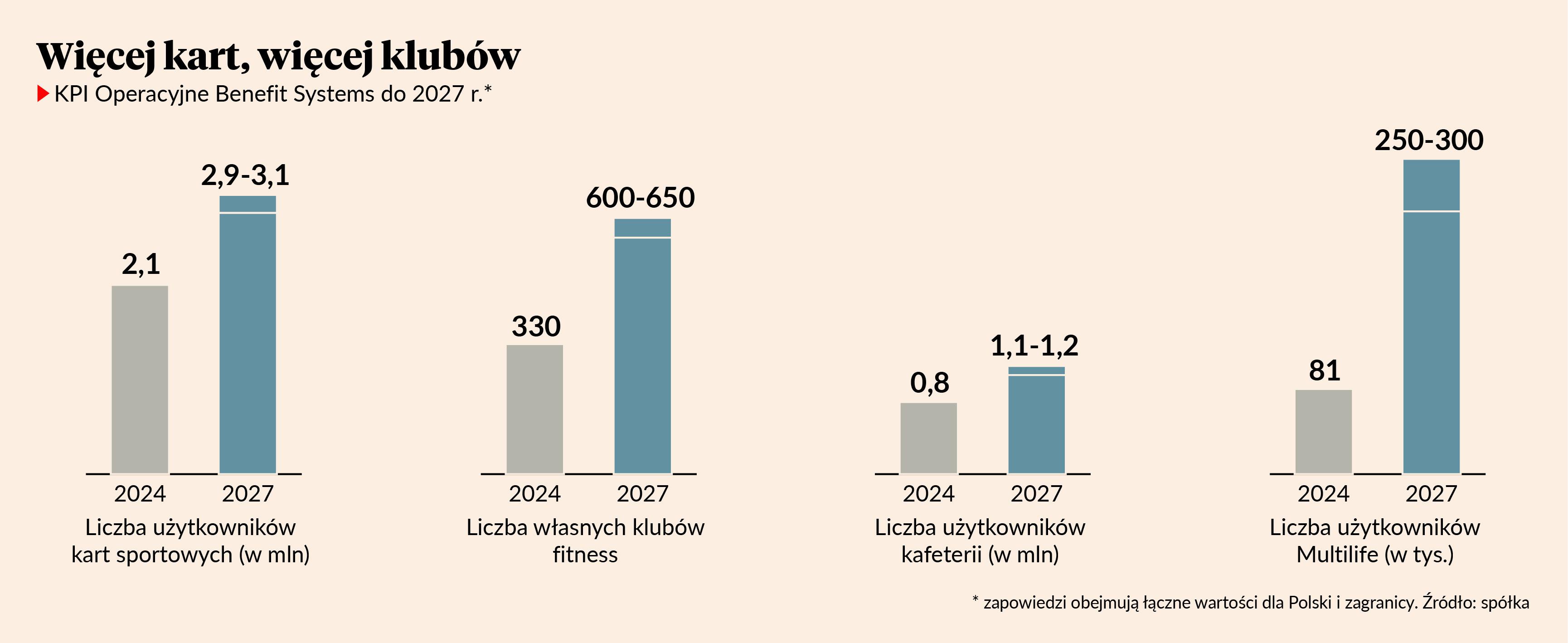 – Zakłada ona osiągnięcie około 2,9-3,1 mln użytkowników kart sportowych, posiadanie 600-650 własnych klubów fitness, około 1,2 mln użytkowników kafeterii, 250-300 tys. użytkowników MultiLife oraz 200-250 tys. użytkowników w obszarze food. Wierzymy, że realizacja tych celów operacyjnych pozwoli nam osiągnąć przychody na poziomie około 6 mld zł w tym trzyletnim okresie, z marżą operacyjną w przedziale 17-18 proc. – mówi Marcin Fojudzki, członek zarządu Benefit Systems.