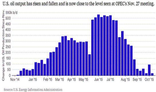 W pierwszym tygodniu października amerykańska produkcja ropy sięgała 9,1 mln baryłek dziennie i była o 500 mln baryłek niższa niż w szczycie z czerwca, wynika z obliczeń agencji EIA. Tym samym został wymazany niemal cały wzrost produkcji zanotowany od listopada ubiegłego roku, kiedy zaniepokojony utratą udziałów w rynku OPEC zrezygnował z ograniczania produkcji i pozwolił, by spadek cen zmusił do ograniczenia wydobycia producentów o wyższych kosztach. Wyhamowanie produkcji w USA rozciągnie się na przyszły rok, kiedy wydobycie sięgnie średnio 8,86 mln baryłek dziennie, zapowiada EIA.