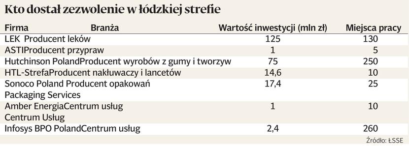 690 miejsc pracy i utrzymanie 3,1 tys. deklaruje siedem firm, które w pierwszym półroczu dostały zezwolenia na działalność w Łódzkiej Specjalnej Strefie Ekonomicznej (ŁSSE). Uroczyste wręczenie odbyło się wczoraj. Firmy zainwestują 235 mln zł. Największe pod względem wartości projekty planują LEK i Hutchinson Poland. LEK zwiększy zatrudnienie w zakładzie w Strykowie do 370 osób. Hutchinson dzięki nowemu projektowi będzie miał niemal 1 tys. pracowników w zakładzie Łódź 1. O 260 osób powiększy się centrum usług Infosys BPO Poland, którego załoga już dziś liczy ponad 1,5 tys. pracowników. Amber Energia, która sprzedaje prąd i dopiero zaczyna rozwijać działalność usługową — najpierw wewnątrz grupy, w przyszłości być może dla klientów zewnętrznych — zacznie od 10 osób. HTL-Strefa rozbuduje zakład w Łęczycy. Firma zrealizuje projekt w trzy lata i utrzyma ponad 650 etatów. Sonoco, producent opakowań, który przyszedł do łódzkiej strefy za Gillette (dziś P&G) i był podwykonawcą firmy, teraz zbuduje w Kutnie własną halę. Polska firma ASTI, producent przypraw, zbuduje natomiast halę produkcyjną i laboratorium.