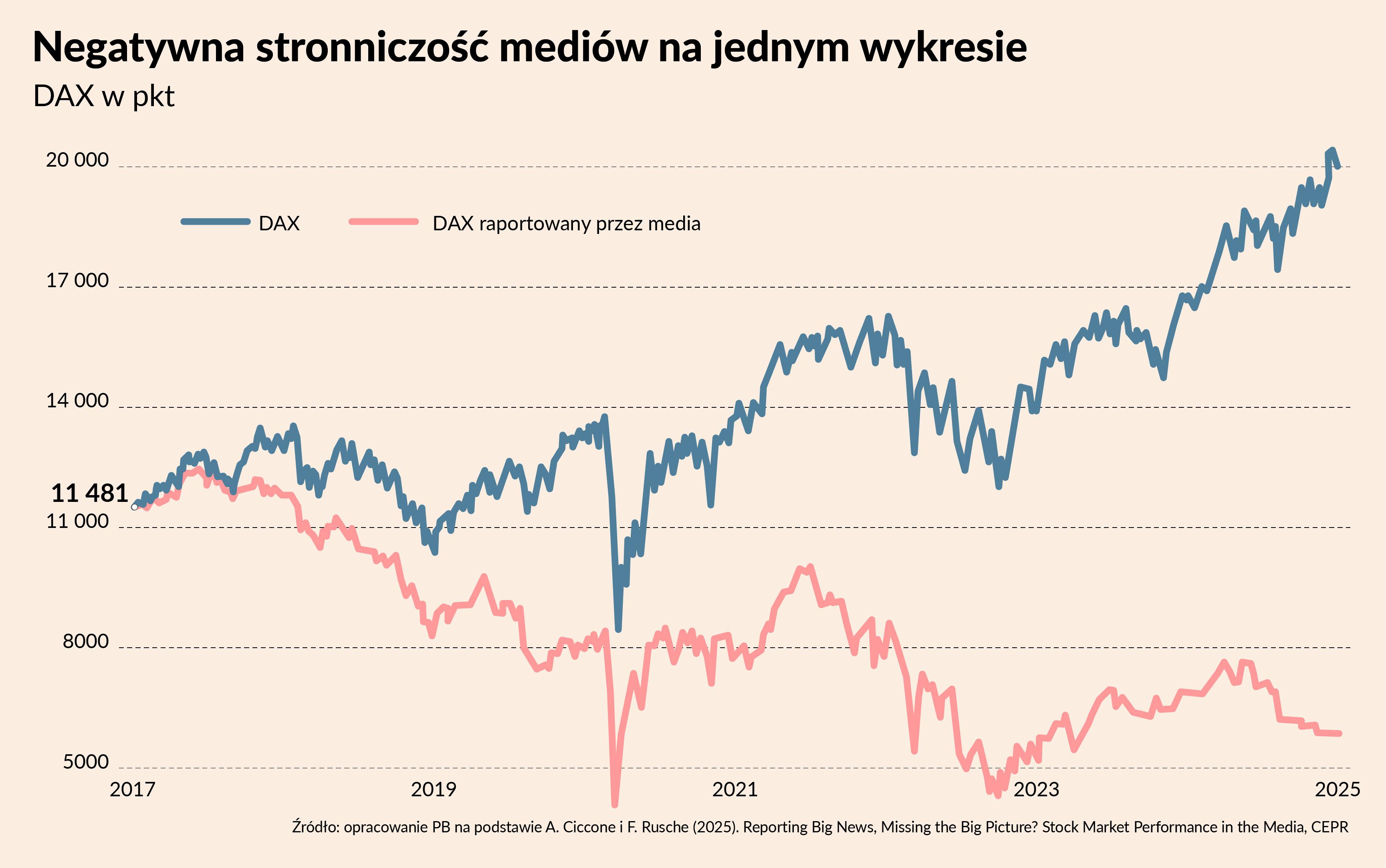 Weźmy za przykład rynek akcji. Dane zebrane przez dwóch ekonomistów, Antonia Ciccone i Feliksa Rusche, przedstawiają dużą lukę pomiędzy rzeczywistym a relacjonowanym przez niemiecki dziennik informacyjny ZDF Heute-journal indeksem DAX. W latach 2017-24 DAX wzrósł o 73,4 proc. Jednak gdybyśmy w tym czasie codziennie śledzili zmiany indeksu, bazując tylko na wieczornym wydaniu wiadomości, ostatecznie dostalibyśmy zupełnie inny wynik: spadek indeksu giełdowego o blisko połowę.