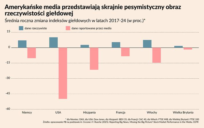 Taki sam efekt – negatywnej stronniczości – występuje w innych krajach rozwiniętych: w USA, Hiszpanii, Francji czy we Włoszech. Jedynym wyjątkiem jest Wielka Brytania. W gospodarce amerykańskiej średnioroczna zmiana indeksu giełdowego Dow Jones w latach 2017-24 wyniosła 10,1 proc. Natomiast według codziennego przekazu w mediach było to -49,8 proc. Czyli faktyczne dane pokazują solidne wzrosty, relacje z mediów — potężną bessę.