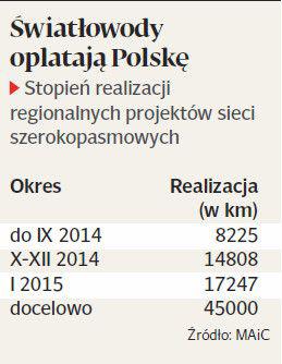 W ostatnim kwartale ubiegłego roku we wszystkich województwach zbudowano łącznie 4,27 tys. km nowych światłowodów, a 2,3 tys. km sieci wydzierżawiono. W styczniu 2015 r. natomiast wybudowano 540 km, a 1899 km jako gotowe zgłosiła Małopolska Sieć Szerokopasmowa (spółka zależna giełdowego Hyperiona), która wydzierżawiła światłowody m.in. od Orange. To właśnie w Małopolsce budowa najbardziej się ślimaczy — prace zaawansowane są w 25 proc. Piotr Majchrzak, prezes Hyperiona, jeszcze w styczniu na łamach „PB” informował, że spółka będzie w najbliższych miesiącach musiała pozyskać 50 mln zł, by dokończyć budowę sieci, która ma liczyć 3 tys. km.