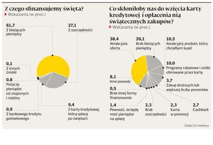 Zakupy skredytuje nieco ponad 11 proc., przy czym naprawdę zadłuży się i będzie spłacało odsetki tylko 0,9 proc. respondentów, deklarujących chęć zaciągnięcia kredytu bankowego. 0,8 proc. biorących udział w badaniu zapożyczy się u rodziny i znajomych, którzy, jak można założyć, nie policzą sobie procentów od pożyczki. 9,4 proc. respondentów też chce uniknąć opłat z tytułu zadłużenia, sięgając po kartę kredytową, którą, jak deklarują, „spłacą po świętach”, czyli skorzystają z okresu bezodsetkowego. Praktyka pokazuje, że w dużej mogą to być świąteczne życzenia.