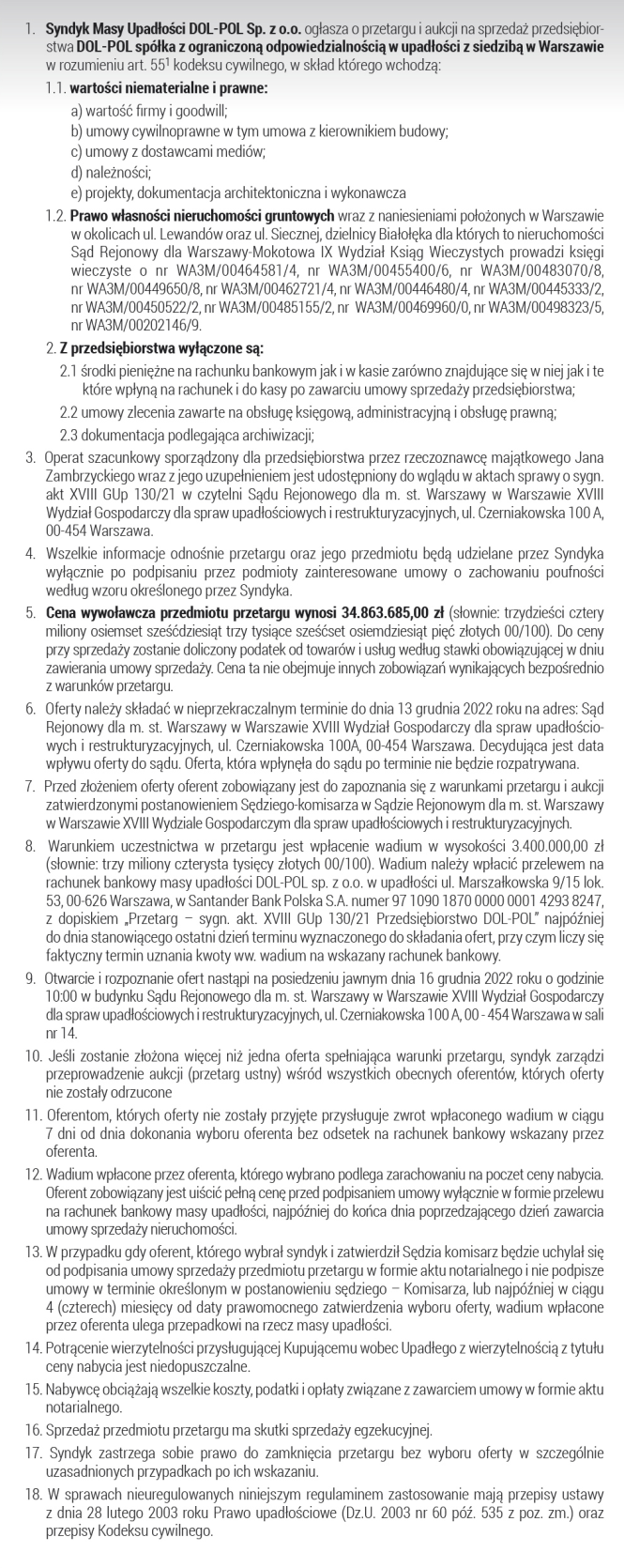 Syndyk masy upadłości DOL-POL Sp. z o.o. ogłasza o przetargu i aukcji na sprzedaż przedsiębiorstwa Komunikat partneraopublikowano: 2022-11-21 12:39PosłuchajZostań subskrybentemi słuchaj tego oraz wielu innych artykułów w pb.pl
