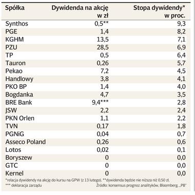 Z tym inwestorzy zdążyli się już oswoić w poprzednich kwartałach, więc wczoraj żyli deklaracją zarządu spółki o wypłacie co najmniej 0,50 zł dywidendy na akcję z ubiegłorocznego zysku. Kurs rósł o 1,7 proc., najmocniej w WIG20, a rósłby pewnie bardziej, gdyby nie obawa, że taka hojność wkrótce się skończy wraz ze spadającymi zyskami i kurczącymisię zasobami gotówki. Na razie stopa dywidendy jest imponująca, bo przekracza 9 proc. To najwięcej wśród spółek z WIG20, gdzie jeszcze do wtorku brylowała TP, ale po ścięciu dywidendy o kolejne 0,5 zł wypadła poza podium. Oprócz Synthosu są na nim jeszcze PGE i KGHM, a czwarte miejsce zajmuje KGHM. Stopę dywidendy powyżej 5 proc. ma jeszcze Tauron, a trójka banków — PKO BP, Handlowy i PKO BP — mieszczą się w przedziale 4-4,5 proc., przy średniej dla wszystkich blue chipów na poziomie 3,5 proc. Dwie spółki — GTC i Boryszew — według analityków w ogóle nie podzielą się zyskiem, tak samo będzie najprawdopodobniej z Kernelem i Lotosem.