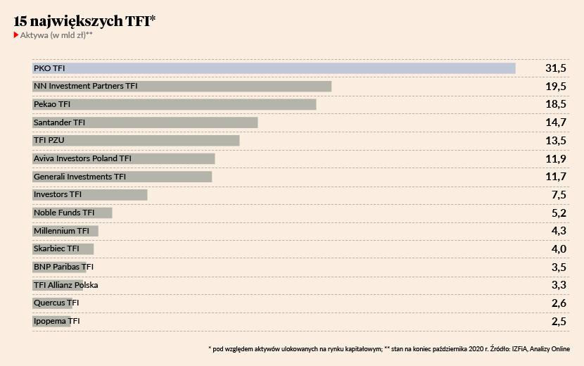 Na pewno nie można utożsamiać słów: bankowe i duże. Czterech największych asset managerów na rynku ma powiązania kapitałowe z czterema największymi bankami. Ale już Millennium TFI czy BNP Parbias TFI grają w zupełnie innej lidze. Znacznie większe od nich jest nie tylko grupa TFI firm ubezpieczeniowych, ale również Investors TFI, będące największym podmiotem nie wchodzącym w skład żadnej większej grupy kapitałowej.