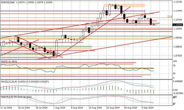 W krótkiej perspektywie wpływ na EURUSD może mieć debata telewizyjna Trump - Harris. Na rynku uważa się, że wyborcza wygrana Trumpa mogłaby wpłynąć na skalę oczekiwanych cięć stóp przez Fed i tym samym podbić dolara, podczas kiedy wygrana Harris może dać impulsy do jego dalszego osłabienia. Jutro (tj. w środę) poznamy też dane o inflacji CPI w USA za sierpień.