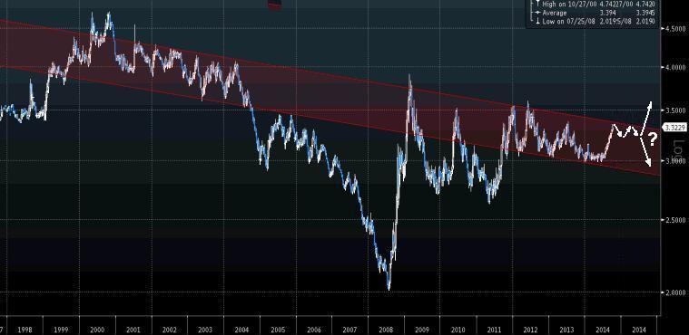 Górne ograniczenie formacji znajduje się na wysokości 3,37 zł i jest to wartość, której notowania amerykańskiej waluty nie powinny przebić, przynajmniej w ciągu najbliższych kilku miesięcy. Bardzo możliwa jest konsolidacja lub lekkie opadanie notowań dolara. Za sprawą oczekiwań na podwyżkę stóp procentowych Fedu powrót w rejon dolnego ograniczenia formacji jest mniej prawdopodobny.