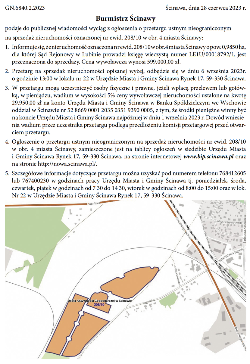 Burmistrz Ścinawy podaje do publicznej wiadomości wyciąg z ogłoszenia o przetargu ustnym nieograniczonym na sprzedaż nieruchomości oznaczonej nr ewid. 208/10 w obr. 4