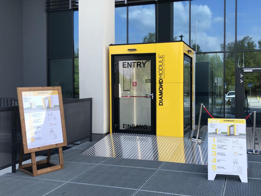 Jego działanie opiera się na informacjach przekazywanych przez lekarzy. Ci od początku alarmują, że jednym z głównych objawów zakażenia jest podwyższona temperatura ciała, kluczową rolę w walce z wirusem odgrywa zaś dezynfekcja. Na tych dwóch kwestiach opiera się zatem działanie PIKS-u. To mobilna śluza do natychmiastowego zastosowania zarówno w budynkach, jak i przy wejściach do nich. Jej największą zaletą jest to, że nie można jej ominąć — odwiedzający daną instytucję musi więc przejść przez bramkę. W tym momencie zaczyna się dokładny, zarazem niezwykle szybki proces dezynfekcyjno-prewencyjny. Specjalnie wyłożona mata usuwa wirusy z obuwia, dozownik z płynem do dezynfekcji wymusza zaś na znajdującym się w środku bramki odkażenie dłoni. Dokładnie w tym samym czasie, dzięki wbudowanej kamerze termowizyjnej, sprawdzana jest temperatura ciała. Ostatni etap to innowacyjne rozwiązanie na rynku, oparte na autorskim algorytmie opracowanym przez rodzime środowisko naukowe. Na tle innych wyróżnia go to, że kamera termowizyjna uwzględnia działanie temperatur zewnętrznych, co przyczynia się do dokonania bardziej precyzyjnego pomiaru. Co ważne algorytm stworzony został tak, by nie gromadzić wrażliwych danych osobowych, jak to bywa w przypadku innych tego typu rozwiązań. W ciągu zaledwie trzech sekund kamera sprawdza temperaturę ciała i sygnalizuje przypadki jej podwyższenia; w prosty sposób — uniemożliwia przejście badanej osoby przez bramkę, a co za tym idzie minimalizuje zagrożenie, związane chociażby z możliwością wejścia do danego obiektu osoby potencjalnie zakażonej. Opracowany przez polskich naukowców algorytm znacznie przyczynił się do podniesienia jakości i precyzyjności działania Punktów Indywidualnej Kontroli Sanitarnej tworzonych przez Diamond Module. Co więcej, bramka zezwalająca na wejście do obiektu nie otworzy się także w przypadku chęci ominięcia danego kroku, np. braku dezynfekcji dłoni. Jeśli wszystkie kroki wykonane zostaną poprawnie, przejście przez bramkę zajmuje zaledwie kilkanaście sekund.