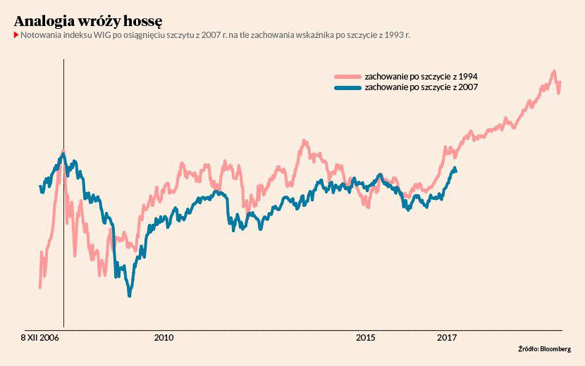 Choć za trzy miesiące minie 10 lat od ustanowienia przez indeks WIG rekordu wszech czasów z 2007 r., to do jego pobicia indeksowi wciąż brakuje 16-procentowej zwyżki. Jeśli wierzyć historycznym analogiom, to jednak jest szansa, że na nowy rekord nie trzeba będzie już długo czekać. Wszystko przez podobieństwo notowań WIG sięgających szczytu z 2007 r. do ścieżki, którą indeks podążał po wyjściu na rekord w 1994 r.