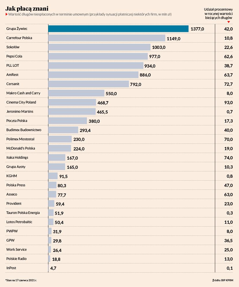 Z zestawienia wynika, że część wielkich firm nie spłaca w terminie sporej części długów. Bardzo często problemy te są skutkiem nieuzyskania należności od dłużników. Na liście wyraźnie widać też rzetelnych płatników - przykładem jest KGHM. Choć w ubiegłym roku miedziowemu potentatowi dłużnicy nie zapłacili w terminie umownym aż 1,4 mld zł, to sam miał tylko 91,5 mln zł zobowiązań niespłaconych na czas (tylko 0,8 proc. wartości wszystkich świadczeń pieniężnych, do których był zobowiązany KGHM). Dobrą statystyką może się też pochwalić PKO BP, który nie zapłacił w terminach umownych tylko 6,1 mln zł, co stanowiło 0,0051 proc. jego zobowiązań.