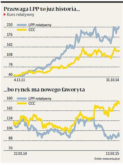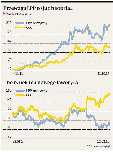 — Obecnie CCC budzi coraz większe zainteresowanie zarówno inwestorów krajowych, jak i zagranicznych. Spółce udaje się rosnąć, dotrzymuje obietnic i ma rozsądną strategię. Z drugiej strony, poprzedni ulubieniec inwestorów słabnie — tłumaczy Łukasz Wachełko. CCC jest jednak ciągle spółką znacznie mniejszą niż LPP. Za trzy kwartały 2014 r. miała 1,3 mld zł przychodów i 110 mln zł zysku. LPP — odpowiednio 3,4 mld i 236 mln zł.