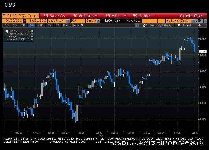 Inflacja w strefie euro spadła w październiku do 0,7 proc., kształtując się wyraźnie poniżej oczekiwań analityków. Zdaniem specjalistów, otwiera to EBC drogę do wsparcia gospodarki obniżką stóp procentowych. Tymczasem oczekiwania rynkowe zakładają, że amerykańska Rezerwa Federalna rozpocznie w marcu zmniejszanie programów skupu aktywów. Jeszcze po wrześniowym posiedzeniu Fedu rynek oczekiwał zmniejszenia wsparcia dla gospodarki w grudniu. Tymczasem banki Morgan Stanley oraz Royal Bank of Scotland spodziewają się, że nowa edycja stress testów europejskich banków zmusi je do sprowadzenia kapitałów zza granicy, wywierając presję na dalsze zwyżki euro wobec dolara.- Banki posiadające duże pozycje w aktywach denominowanych w walutach zagranicznych zostaną złapane z ręką w nocniku, gdy nadejdzie ocena jakości ich bilansów. Zostaną zmuszone do dalszej wyprzedaży aktywów zagranicznych i odkupywania euro, co sprawi, że wspólna waluta będzie notowana powyżej pułapów, na które wskazywałyby jej fundamenty – powiedział w wywiadzie z agencją Bloomberg Hans Redeker, szef globalnej strategii walutowej banku Morgan Stanley.