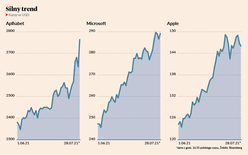 Ewentualne potknięcia big-techów mogłyby się zatem w szybkim tempie negatywnie odbić na wynikach kluczowych wskaźników amerykańskiej giełdy. W II kwartale inwestorzy otrzymali jednak solidne wsparcie w myśleniu o śrubowaniu rekordów głównych indeksów. I to w momencie, gdy na rynkach psuć nastroje zaczęła niepewność dotycząca Chin (tam największe lokalne spółki technologiczne znalazły się na celowniku władz), a Nasdaq tuż przed wtorkową serią publikacji kwartalnych raportów tercetu gigantów zaliczył najgorszą sesję od maja.