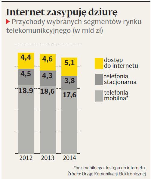 Rosły natomiast przychody z usług dostępu do internetu, które rok do roku skoczyły o 11,5 proc., mimo spadku średniego przychodu na klienta. To głównie zasługa szybko rosnącego segmentu internetu mobilnego. Ponad 80 proc. mieszkańców ma ruchomy dostęp do sieci, przy średniej europejskiej 66,7 proc.