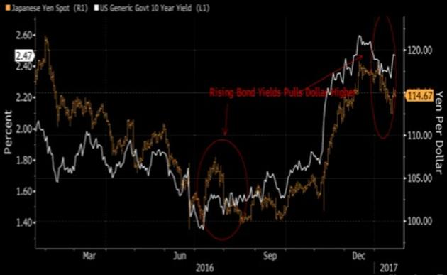 Notowania dolara wyrażone w japońskim jenie (linia żółta, skala prawa), na tle rentowności amerykańskich obligacji 10-letnich (linia biała, skala lewa). Do tej pory im bardziej atrakcyjne były rentowności obligacji USA dla inwestorów zagranicznych, tym bardziej wspierało to dolara. Źródło: Bloomberg.