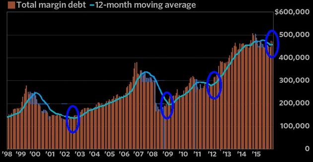 Wartość kredytów zaciągniętych na zakup akcji notowanych na giełdzie nowojorskiej (brązowe słupki), na tle ich średniej wartości z ostatnich 12 miesięcy (linia błękitna). Elipsami zaznaczono momenty, gdy wartość kredytów wychodzi powyżej średniej. Źródło: MarketWatch, NYSE, Ned Davis Research.