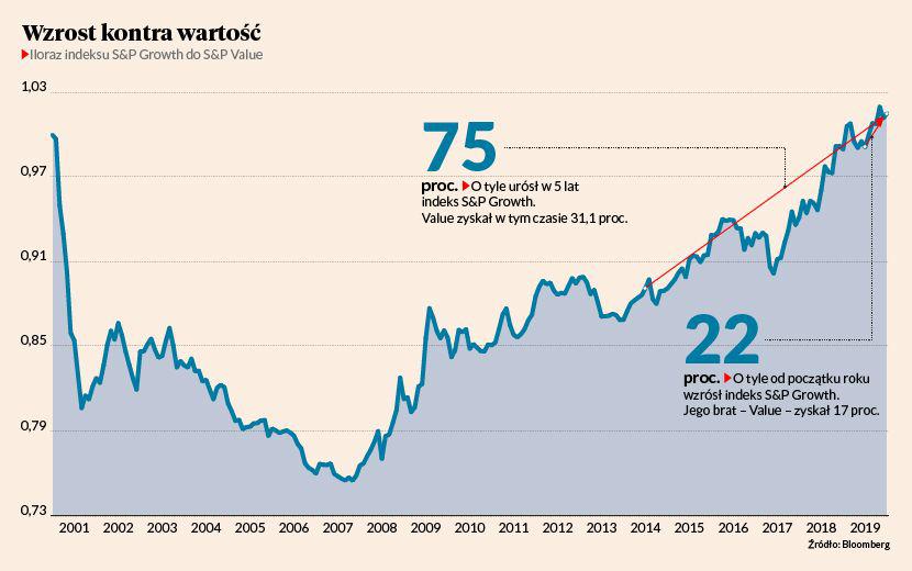 Od początku roku indeks S&P500 Growth, składający się z największych spółek wzrostowych notowanych w Stanach Zjednoczonych, zyskał 22 proc. Natomiast jego odpowiednik, zrzeszający podmioty typu value, czyli te, które w teorii cechują stabilne zyski i dywidendy, urósł o nieco ponad 17 proc. W perspektywie trzyletniej przewaga tych pierwszych jest jeszcze większa i wynosi ponad 7,5 pkt proc.