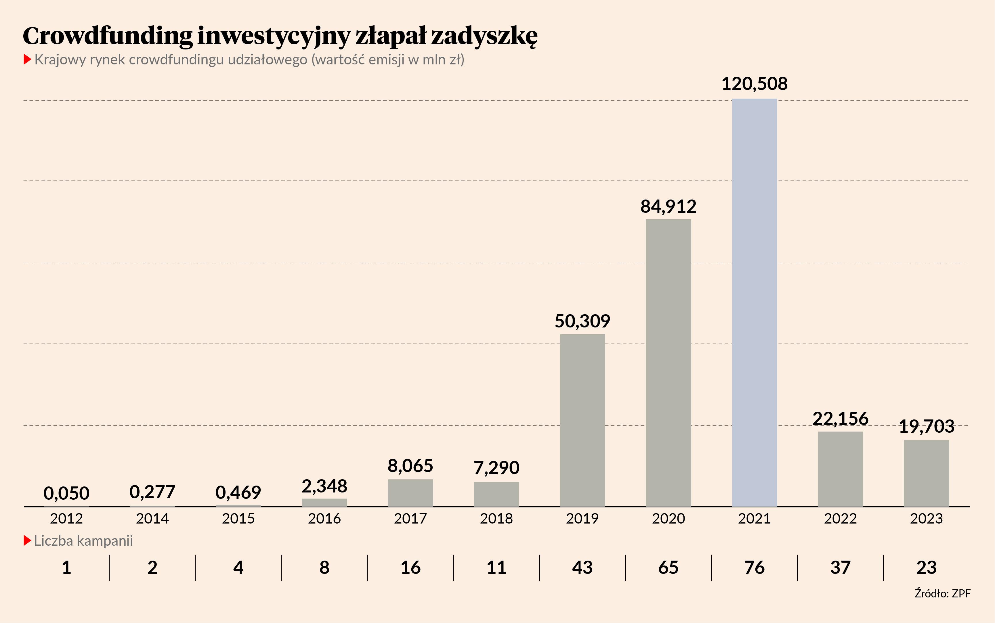 W 2023 r. wartość krajowego rynku crowdfundingu udziałowego wyniosła nieco ponad 19,7 mln zł. Pod tym względem sektor cofnął się do czasu sprzed 2019 r. — wynika z danych Związku Przedsiębiorstw Finansowych (ZPF). W listopadzie ubiegłego roku zyskał szansę na zwiększenie skali działania i profesjonalizację — w życie weszły unijne regulacje, które pozwalają na organizację emisji z limitem do 5 mln EUR (wcześniej maksymalnie 1 mln EUR), a także na tworzenie w obrębie platform tablic z ofertami kupna i sprzedaży akcji spółek nabytych w modelu społecznościowym. Nowe regulacje nie ożywiły jednak przymrożonego w ostatnim czasie rynku. Przypomnijmy, Komisja Nadzoru Finansowego (KNF) wydała dotychczas zgodę na działalność tylko trzem platformom, w tym jednej specjalizującej się w crowdfundingu pożyczkowym (Finansowo.pl) i jednej, która jest w fazie organizacyjnej (GPW Private Market). Aktywne jest tylko Emiteo, w obrębie którego pierwsza spółka — Kombinat Konopny — przeprowadziła emisję w nowym reżimie prawnym. Hurraoptymizmu wśród inwestorów nie było. Dotychczasowy rekordzista, zwykle zdobywający finansowanie w błyskawicznym tempie, w grudniu 2023 r. z oczekiwanych 16,5 mln zł uzyskał ponad 1,9 mln zł. Na początku ubiegłego roku, w ramach poprzedniej emisji, dostał od inwestorów 4,5 mln zł. Sumując — i tak uplasował się w czołówce najpopularniejszych emitentów.