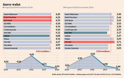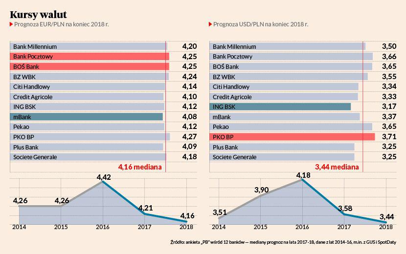 Umocnienie złotego względem euro w 2018 r. będzie wspierane przez dobre perspektywy krajowego wzrostu gospodarczego, w tym przede wszystkim prognozowane przez nas ożywienie inwestycji. Nasilenie oczekiwań dotyczących podwyżki stóp procentowych przez RPP pod koniec 2018 r. przyczyni się w krótkim okresie do niższego kursu EUR/PLN. Uważamy jednak, że w warunkach inflacji kształtującej się wyraźnie poniżej celu rada nie zdecyduje się na podniesienie stóp procentowych w 2018 r., co ostatecznie ograniczy skalę aprecjacji złotego w drugiej połowie roku. Oczekiwany przez nas silny wzrost gospodarczy w strefie euro będzie oddziaływał w kierunku wzrostu kursu EUR/USD, co przy jednoczesnym spadku kursu EUR/PLN przyczyni się do umocnienia złotego względem dolara. Trudne do oceny efekty gospodarcze wprowadzenia reformy podatkowej w USA są głównym czynnikiem ryzyka dla naszej prognozy kursu USD/PLN.