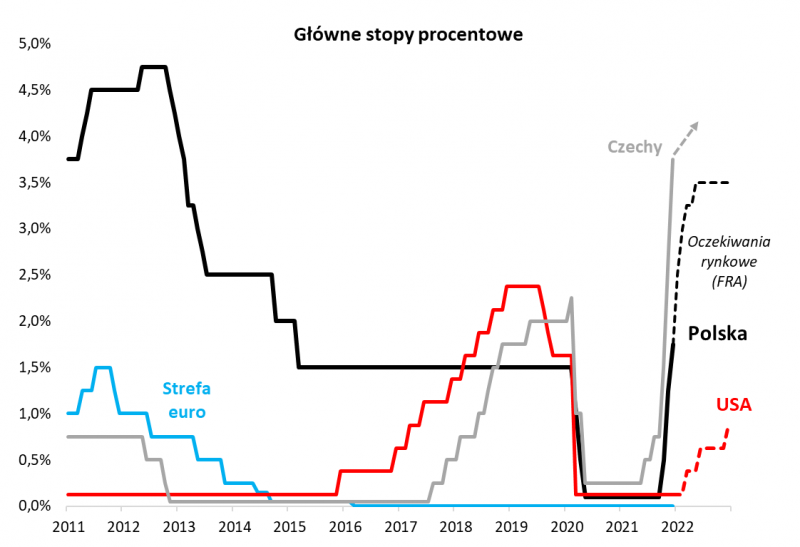 Jeszcze na początku roku wizja wycofania się banków centralnych z reżimu ultra niskich stóp procentowych narzuconego wraz z wybuchem pandemii w I kw. 2020 wydawała się mglistą perspektywą. Rodzima Rada Polityki Pieniężnej długo upierała się przy tezie o „przejściowym” charakterze narastającej presji inflacyjnej, aż w końcu coś pękło w tym gołębim nastawieniu i począwszy od października ruszyła pierwsza od 2012 roku seria podwyżek stóp procentowych. Jak już zwracaliśmy uwagę w poprzednich analizach, tempo i skala zacieśnienia są mocniejsze niż w poprzednich trzech cyklach. I na tym z pewnością nie koniec. Oczekiwania rynkowe m mówią o dojściu stopy referencyjnej do 3,5 proc.