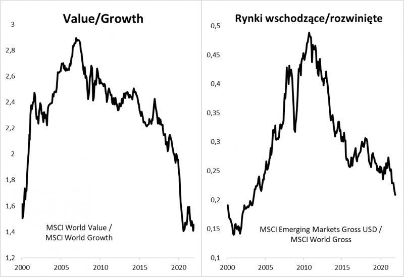 Globalny współczynnik siły relatywnej Value/Growth testował w tym roku … 40-letnie minimum. Dla porównania, na szczytach bańki internetowej w 2000 roku osiągnął „zaledwie” 13-letnie minimum, zanim gwałtownie wystrzelił w górę. Z kolei współczynnik siły relatywnej rynków wschodzących względem rozwiniętych rok kończy na poziomach najniższych od połowy 2003 roku. Być może właśnie takie zapomniane, niemodne, a przez to relatywnie tanie aktywa mieć na uwadze przy konstrukcji długoterminowego portfela inwestycyjnego.