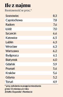Najwyższą rentowność można osiągnąć w — to niespodzianka — Sosnowcu, przy założeniu wynajmu przez 12 miesięcy. Stolica Zagłębia jest też w czołówce jeśli chodzi o porównanie kosztu najmu z ratą kredytu, jaką trzeba zapłacić, kupując mieszkanie. Podobnie jest w Toruniu, Katowicach, Łodzi i Częstochowie. Tam koszt najmu jest bardzo wysoki w porównaniu do raty kredytu, jaką na zakup mieszkania.