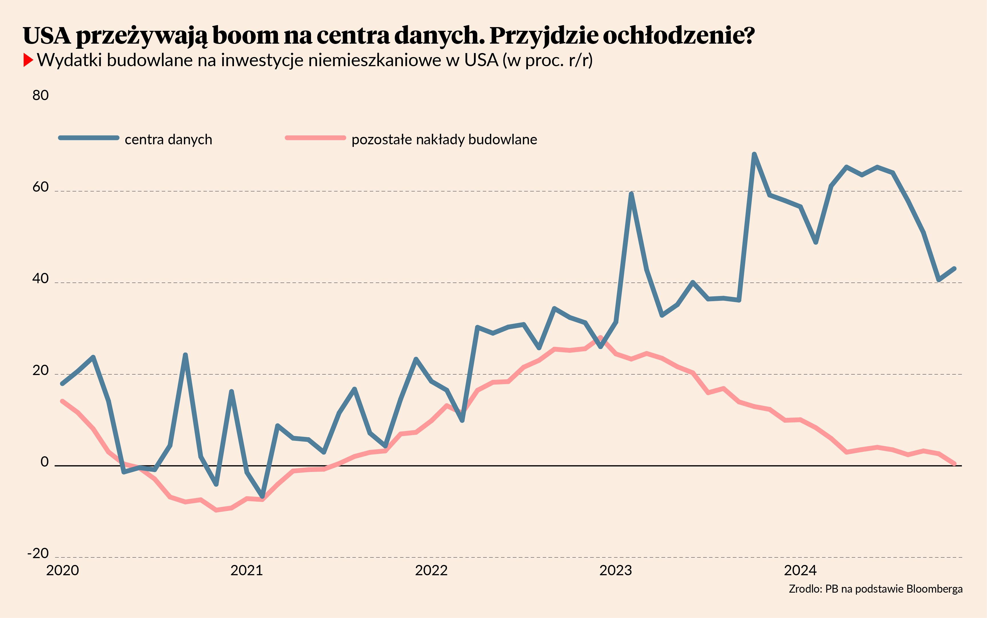 Po drugie, nakłady firm na środki trwałe w amerykańskiej gospodarce rosną dużo wolniej niż pod koniec lat 90., więc nie widać powodu do jakiegoś gwałtownego odwrócenia cyklu inwestycyjnego. Jeszcze w pierwszej połowie 2000 r. inwestycje prywatne w USA rosły w rocznym tempie 14 proc. Teraz jest to 4 proc. To prawda, że w USA trwa boom na centra danych, ale odpowiadają one wciąż za niecałe 5 proc. wszystkich nakładów budowlanych. Ochłodzenie nastrojów wokół AI nie sprawi, że nagle inwestycje w gospodarce zaczną spadać.
