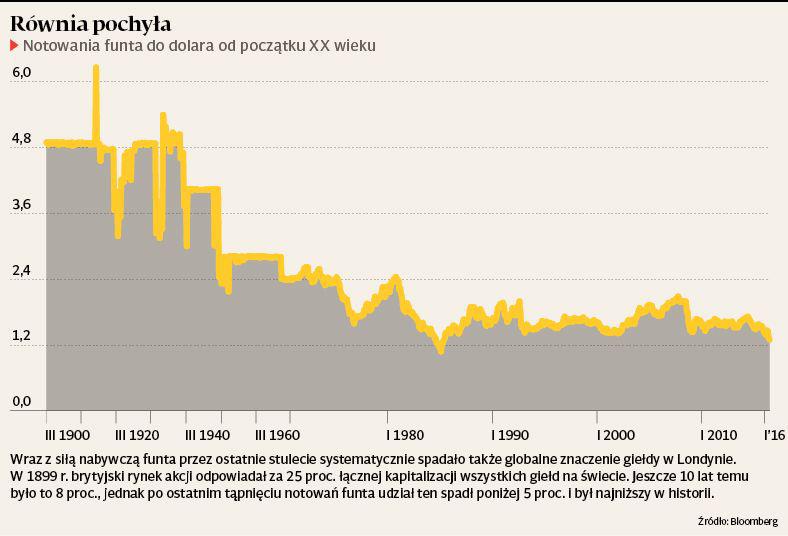 Od dnia referendum w sprawie pozostania Wielkiej Brytanii w Unii Europejskiej notowania funta do dolara tąpnęły o 13 proc. To osłabienie wpisuje się w ostatnie 100 lat historii, w których Wielka Brytania straciła status mocarstwa, a funt przestał być główną walutą rezerwową świata. Jeszcze przed pierwszą wojną światową za funta trzeba było zapłacić prawie 5 USD, dziś jest już poniżej 1,30 USD, a zdaniem George’a Sorosa, który zasłynął złamaniem Banku Anglii w 1992 r., wkrótce będzie wart 1,15 USD.