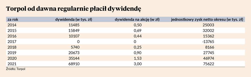 W polityce dywidendowej Torpol zapisał, że intencją zarządu jest, aby spółka była postrzegana przez rynek jako dywidendowa, stabilna inwestycja o charakterze długoterminowym. Zastrzeżono jednak, że tworzenie wartości dodanej dla akcjonariuszy, pozwalające na osiąganie atrakcyjnej stopy zwrotu będzie się odbywać przy zachowaniu perspektyw dalszego rozwoju dla spółki i odpowiedniego poziomu płynności finansowej. Krzysztof Pado, analityk BDM, nie rozumie jednak, dlaczego akurat teraz rada nadzorcza w uzasadnieniu akceptacji deklaracji zarządu odwoływała się do pozycji płynnościowej. Według sprawozdania za 2022 r. Torpol miał 492,8 mln zł gotówki.