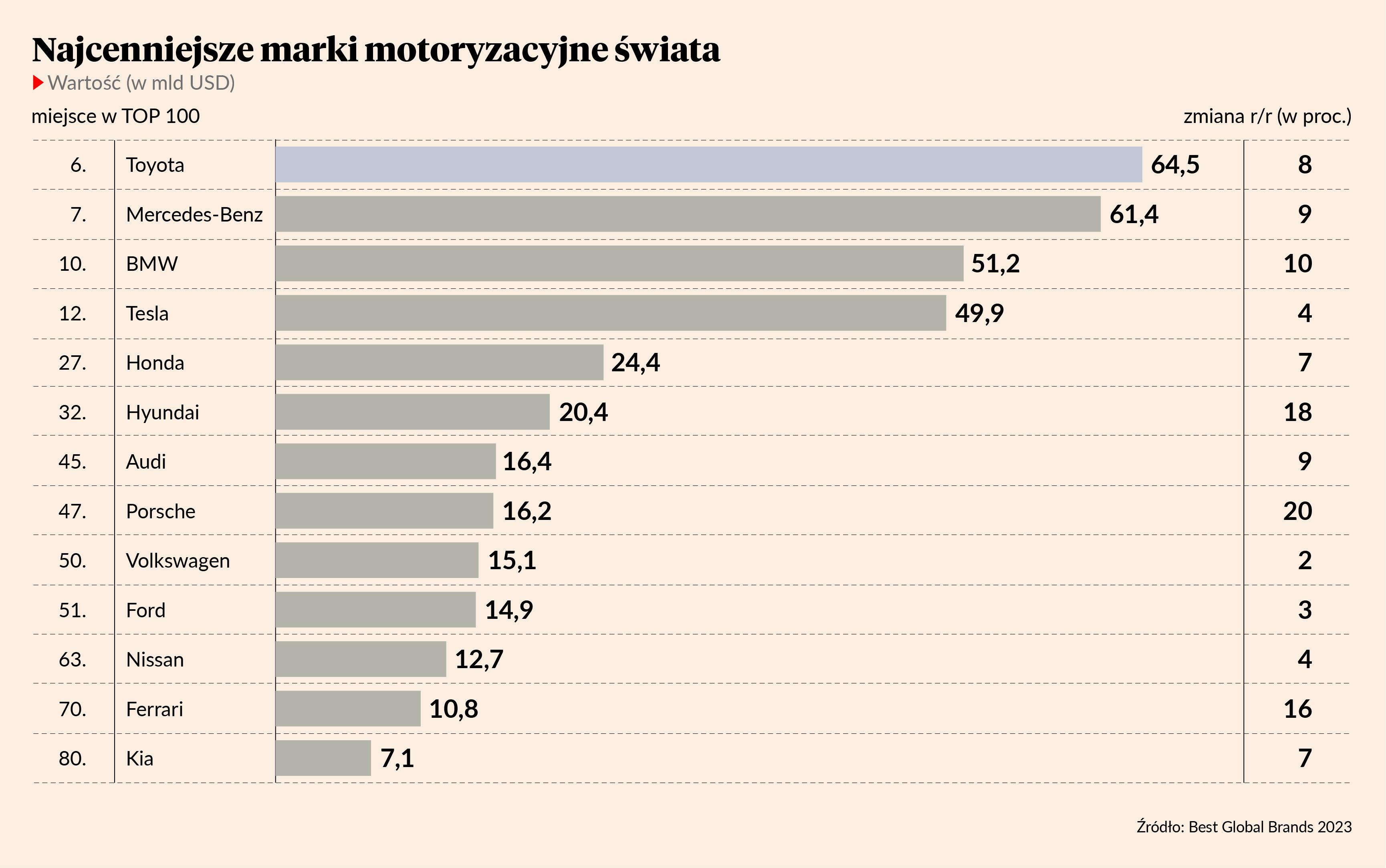 Do tegorocznego zestawienia 100 najcenniejszych marek na świecie zakwalifikowało się jeszcze 12 producentów aut. Wiceliderem w branży jest Mercedes-Benz (61,4 mld USD), a na trzecim miejscu znalazło się BMW (blisko 51,2 mld USD).
