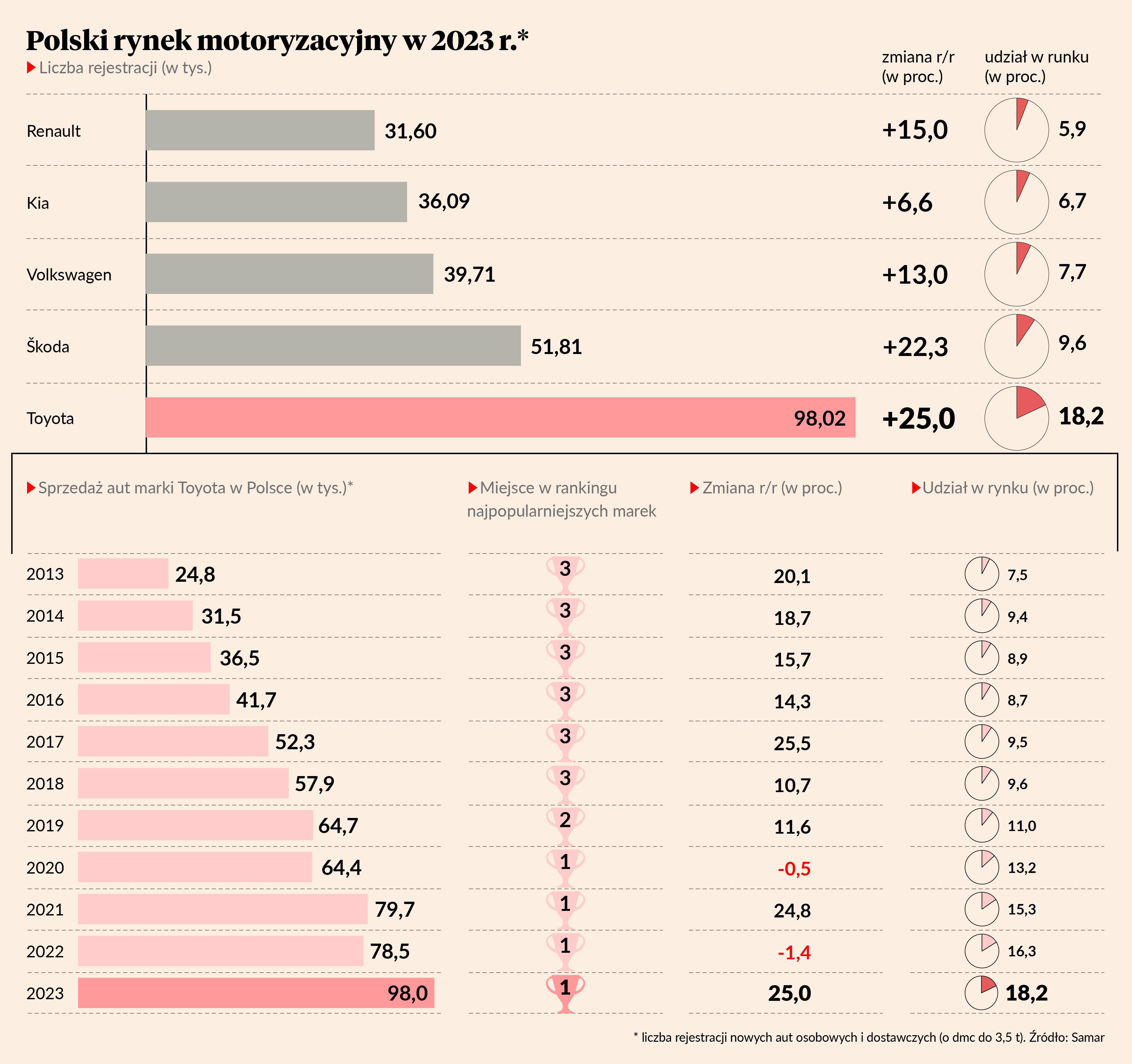 Tyle nowych samochodów zaimportowanych przez Toyota Central Europe zarejestrowano w Polsce w 2023 r. Na liczbę tą składają się 91 195 osobowych i 6826 dostawczych toyot oraz 10 495 lexusów. Łącznie to o 29,8 proc. więcej niż rok wcześniej.