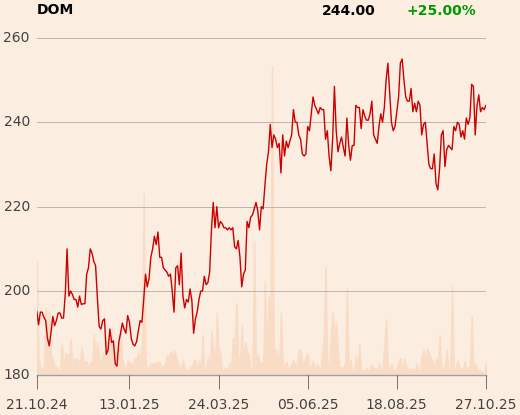 W dniu wydania raportu kurs akcji Dom Development na giełdzie wyniósł 248,5 zł, co daje potencjał wzrostu o 21 proc.